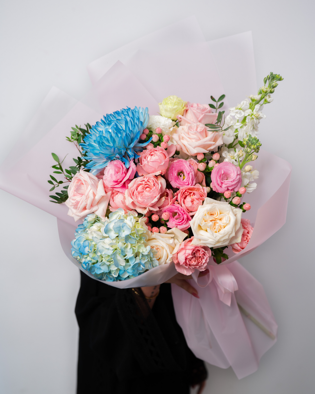 This charming bouquet features soft matthiola and delicate Julietta spray roses, alongside elegant Ohara pink and white roses. Pops of pink hypericum and a mix of white and pink lisianthus bring gentle color, while blue hydrangeas and deco blue add a calming touch. Fresh pistacia leaves provide balance, and the bouquet is beautifully wrapped in pink fabric, offering a harmonious and romantic arrangement.